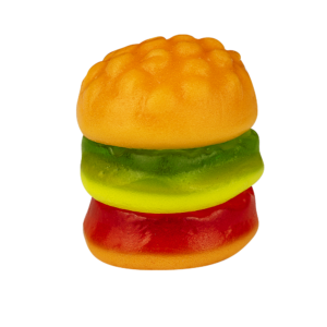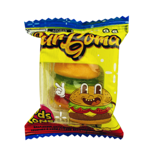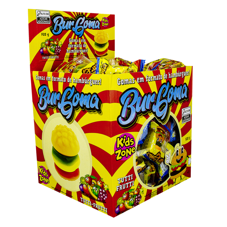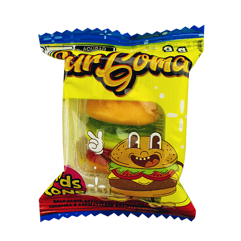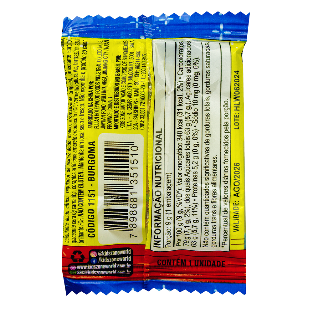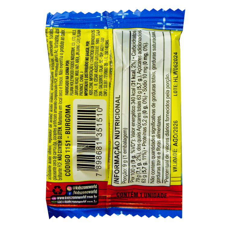 málico, aromatizante artificial, umectante sorbitol, glaceante cera de carnaúba, corantes artificiais amarelo crepúsculo FCF, vermelho