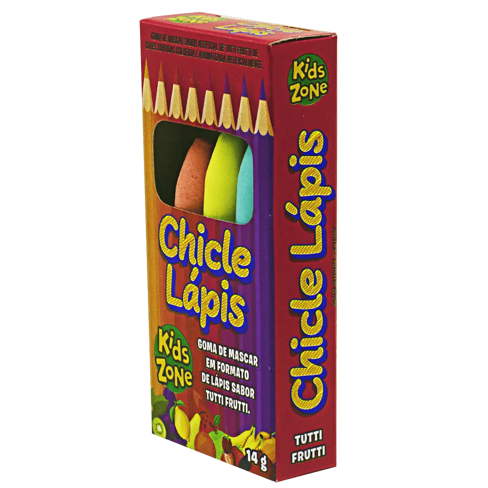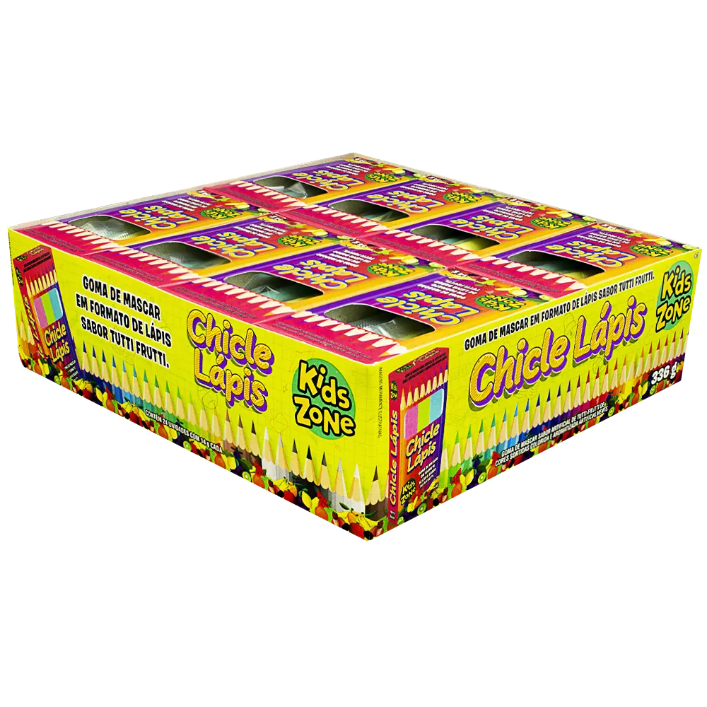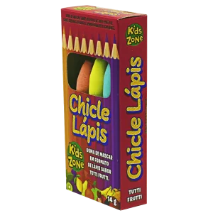 Chiclete em formato de lápis. Sabor tutti-frutti. No display contém 24 unidades com 14g cada. +3