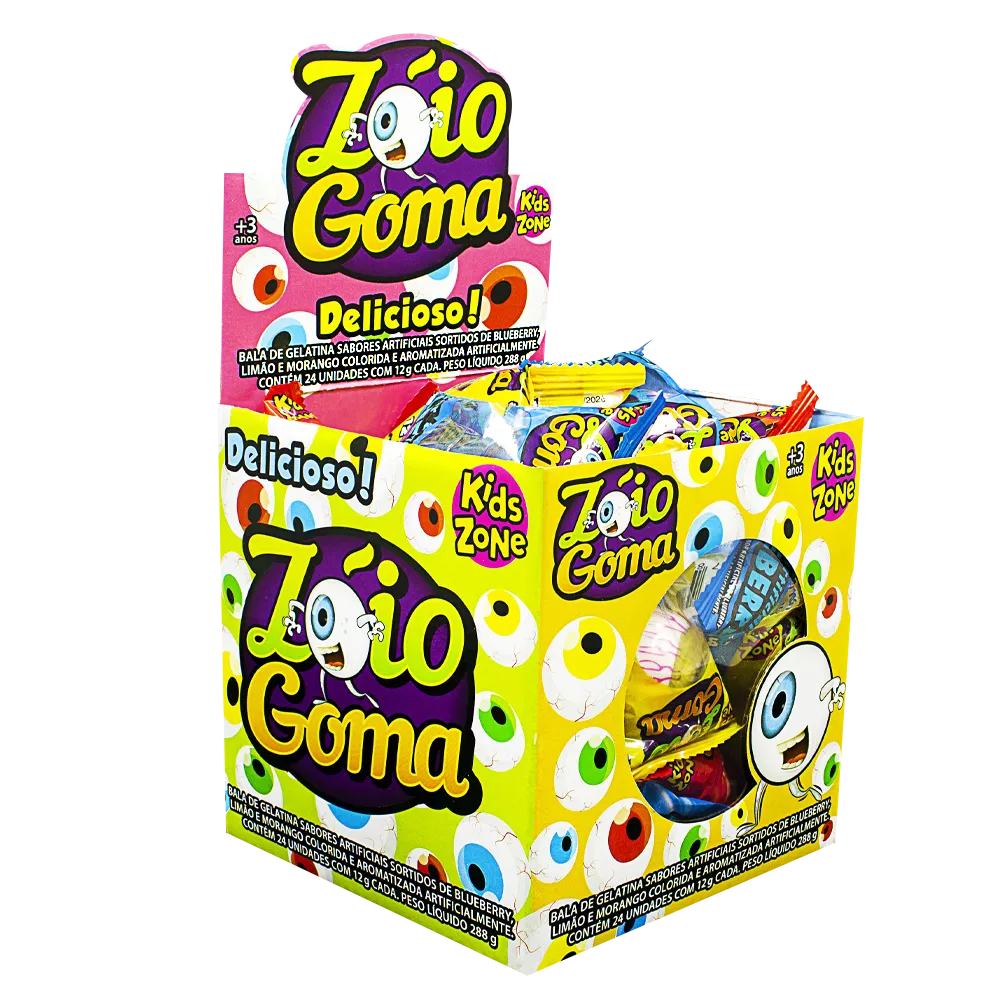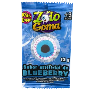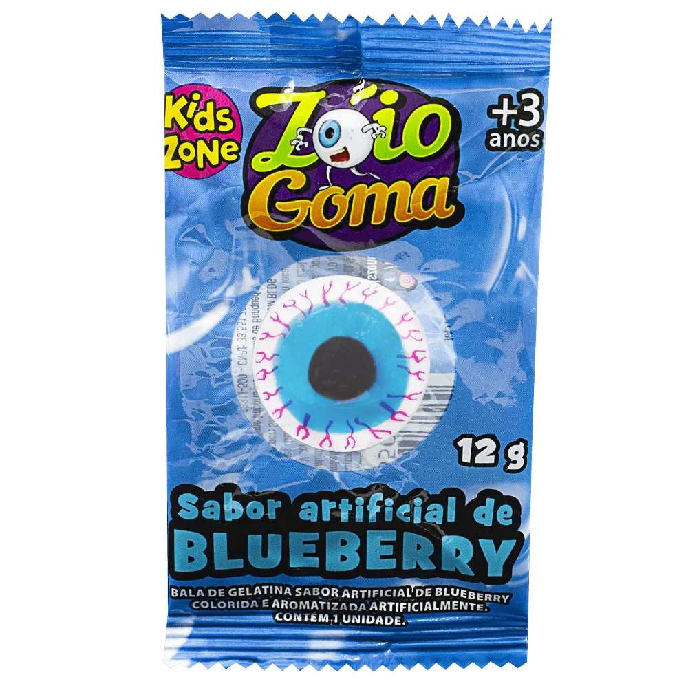 Blueberry: Xarope de glucose, açúcar, gelificante, gelatina, amido modificado, acidulante ácido citrico, aromatizante, óleo vegetal de palma, glaceante cera de carnaúba, corante artificial azul brilhante.